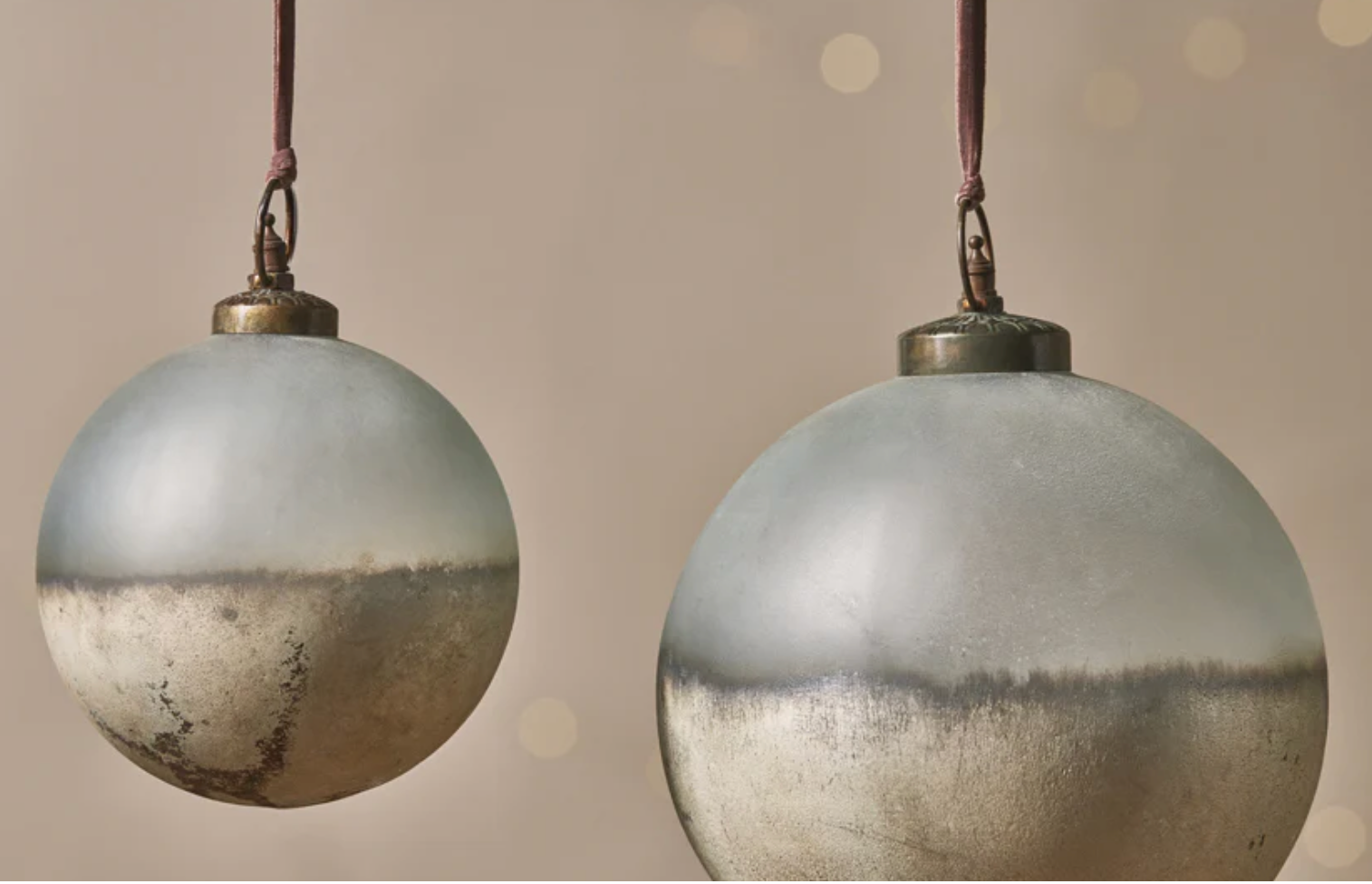These Nkuku Ngolo giant baubles are bold and beautiful. The smoky frosted glass looks like its been dipped in silver and the rustic antique finish guarantees these baubles will stand out. Their striking design means they would look equally as stylish suspended from your ceiling or strung together to form festive garlands. The bauble is hung with a taupe cotton velvet tie.