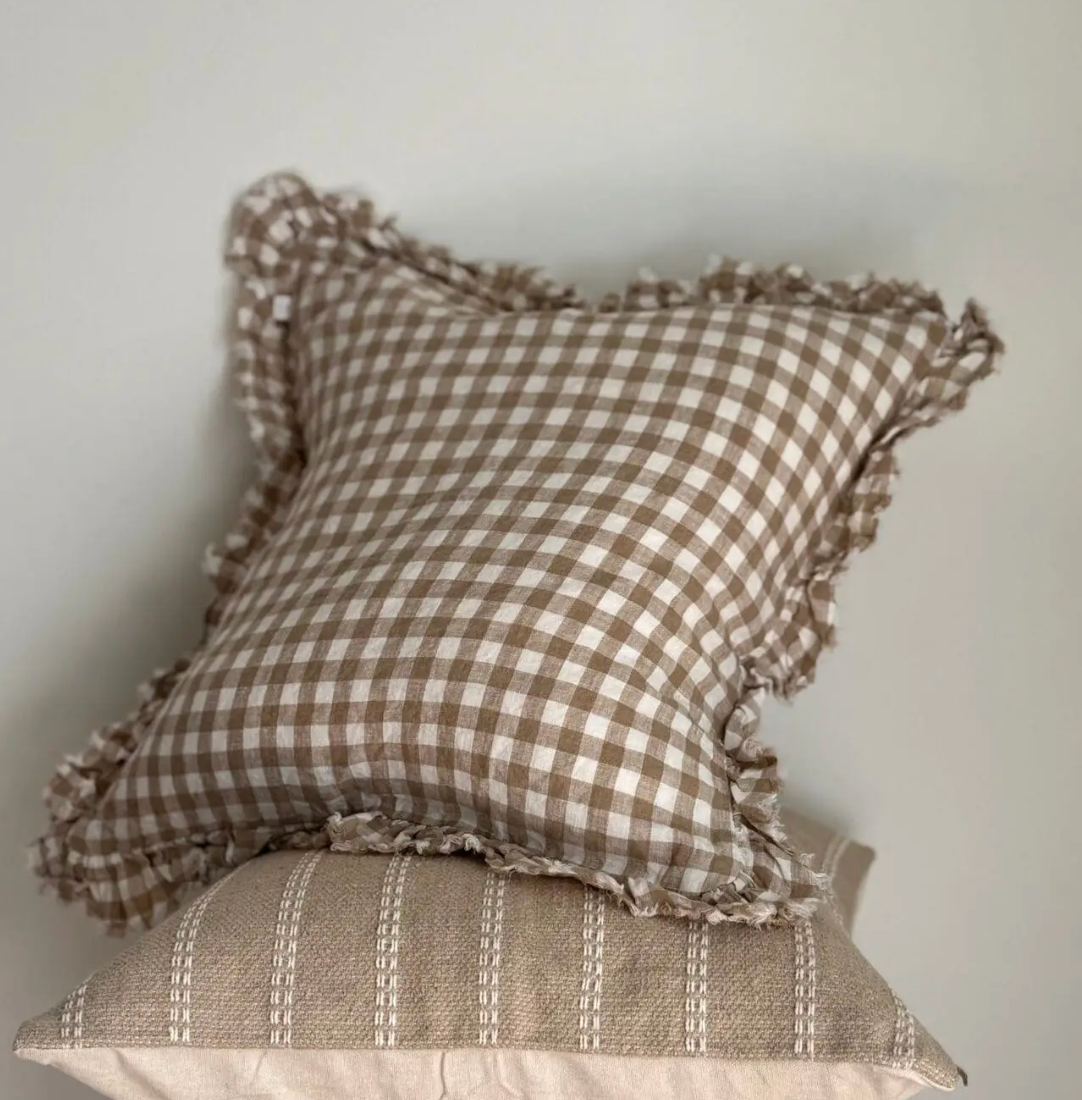 Add timeless charm and soft texture to your home with this handpicked stonewashed linen cushion cover. Featuring a classic cream and brown gingham check design with delicate ruffled edging, it’s a versatile piece that blends effortlessly into both modern and traditional interiors.