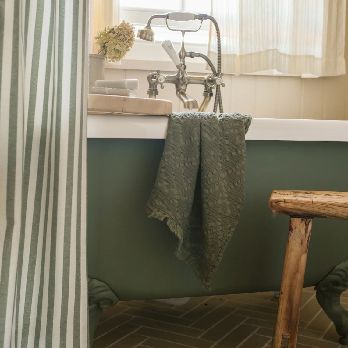 Indulge in the luxury of everyday essentials with this olive green Lace Waffle Hand Towel. Crafted from 100% cotton, its soft, textured waffle weave provides both absorbency and style, while the relaxed fringe edging adds a touch of effortless charm. Perfect for adding a subtle yet elegant detail to your bathroom or kitchen, this beautiful towel combines functionality with timeless design.